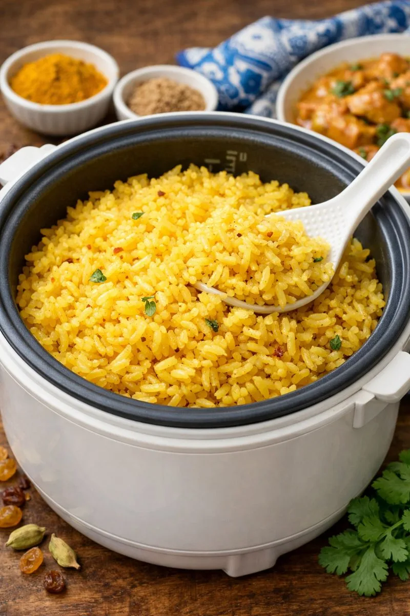 A lightly sweet, aromatic basmati rice made in the rice cooker with turmeric and cardamom — fluffy, golden, and perfect for pairing with rich curries or coconut-based dishes.